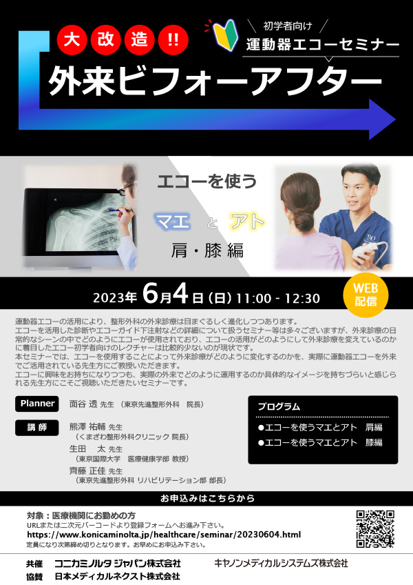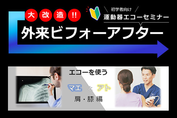 | タイトル | 初学者向け運動器エコーセミナー 大改造!!外来ビフォーアフター エコーを使うマエとアト 肩・膝編 |