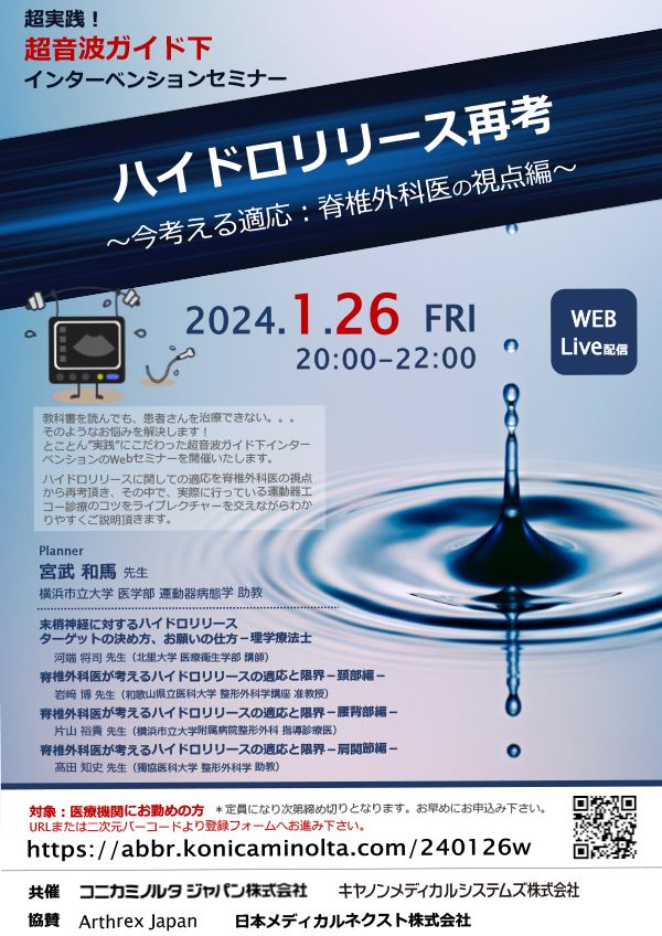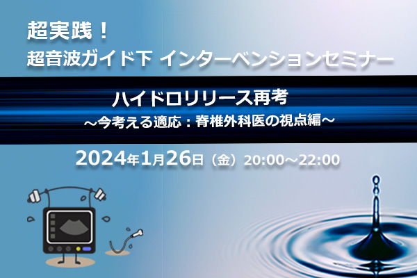 今回のテーマは「ハイドロリリース再考 ~今考える適応:脊椎外科医の視点編~」です。ハイドロリリースに関しての適応を脊椎外科医の視点から再考頂き、その中で、実際に行っている運動器エコー診療のコツをライブレクチャーを交えながらわかりやすくご説明頂きます。