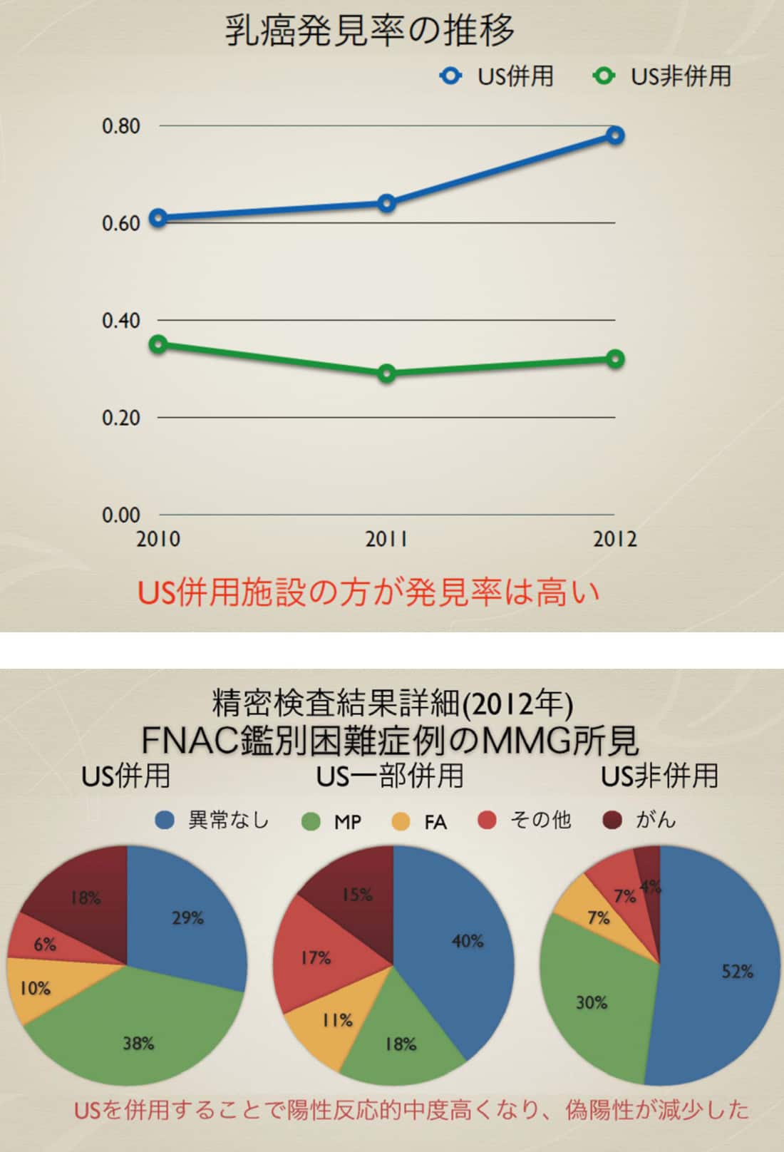 私は1990年から四半世紀、ほぼ毎日乳癌検診・乳腺外来を行ってきています。 1993年から1995年ごろ、マンモグラフィと超音波検査のどちらが優れているかという議論が沸き上がり、私は超音波派の論客としてマンモグラフィ派と対峙しました。 当時は完全に敗れたわけですが、当院では、今までに触診の単独検診はしたことはなく、マンモグラフィ検診も施設検診であるので、全例に超音波を併用しています。これまでマンモグラフィ単独検診は1例も行っておりませんし、今後も行うつもりはありません。 現在も、年間5,000例の乳房超音波検診を行い、生涯検査数は10万件を超えています。これまで超音波検診の有用性をずっと信じてまっすぐ進んできました。 日本人の乳房は超音波検査に適しているのは間違いありません。これを普及させたいという一心で、私はいろいろなところで講演してきました。
