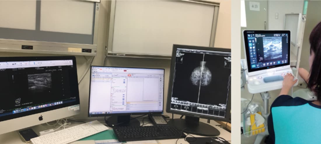 CADの検出結果は、院内LANで送信できます。多くの超音波検査室には、通常、高額なマンモグラフィ用のモニタはありません。 技師はマンモグラフィを読まないまま、もしくは医師が読影したマンモグラフィの所見を見ながら検査をすることになりますが、この医師の読影時間が惜しいと感じていました。 そこで、マンモグラフィを撮ってすぐに院内LANでiPadに送信し、その結果を見ながら超音波検査をすれば良いのではないか、という発想から、このシステムが構築されました。