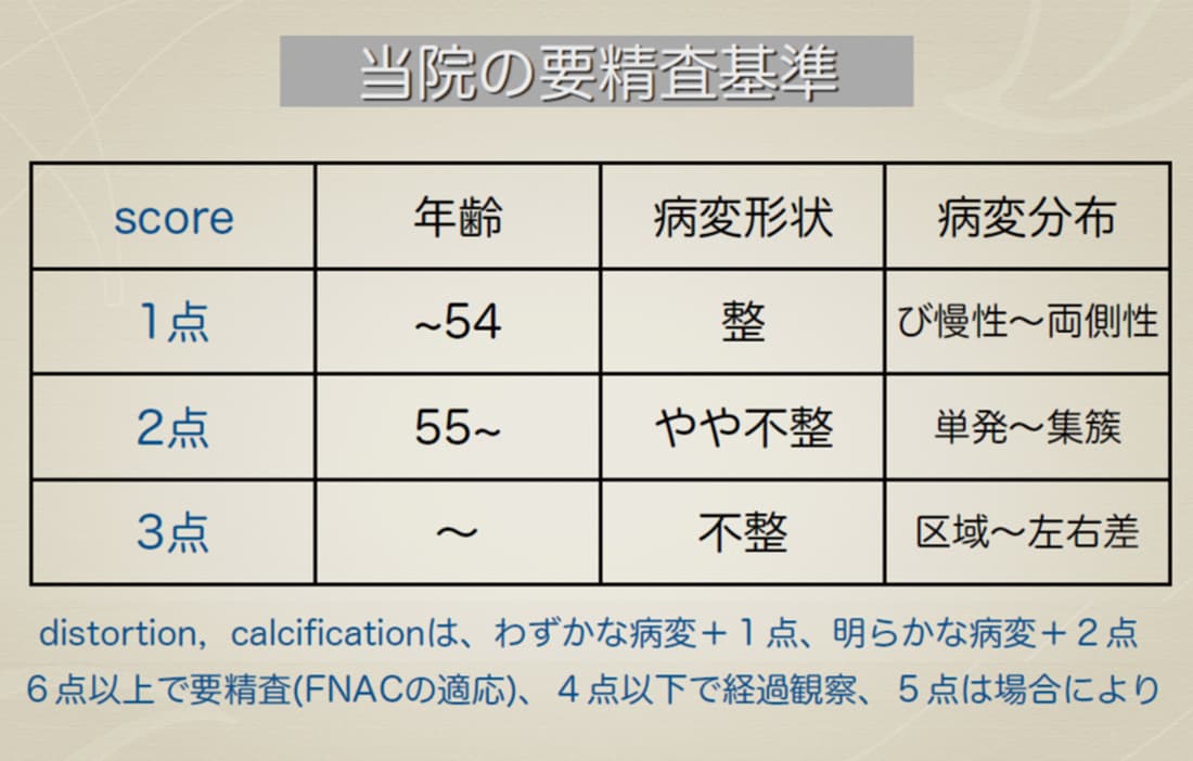 年齢、形状、分布をスコア化し、低エコー病変(mass)、石灰化、distortionの3要素を加味して点数化していく方法。6点以上で要精査、5点は場合により精査、4点以下は経過観察となる。