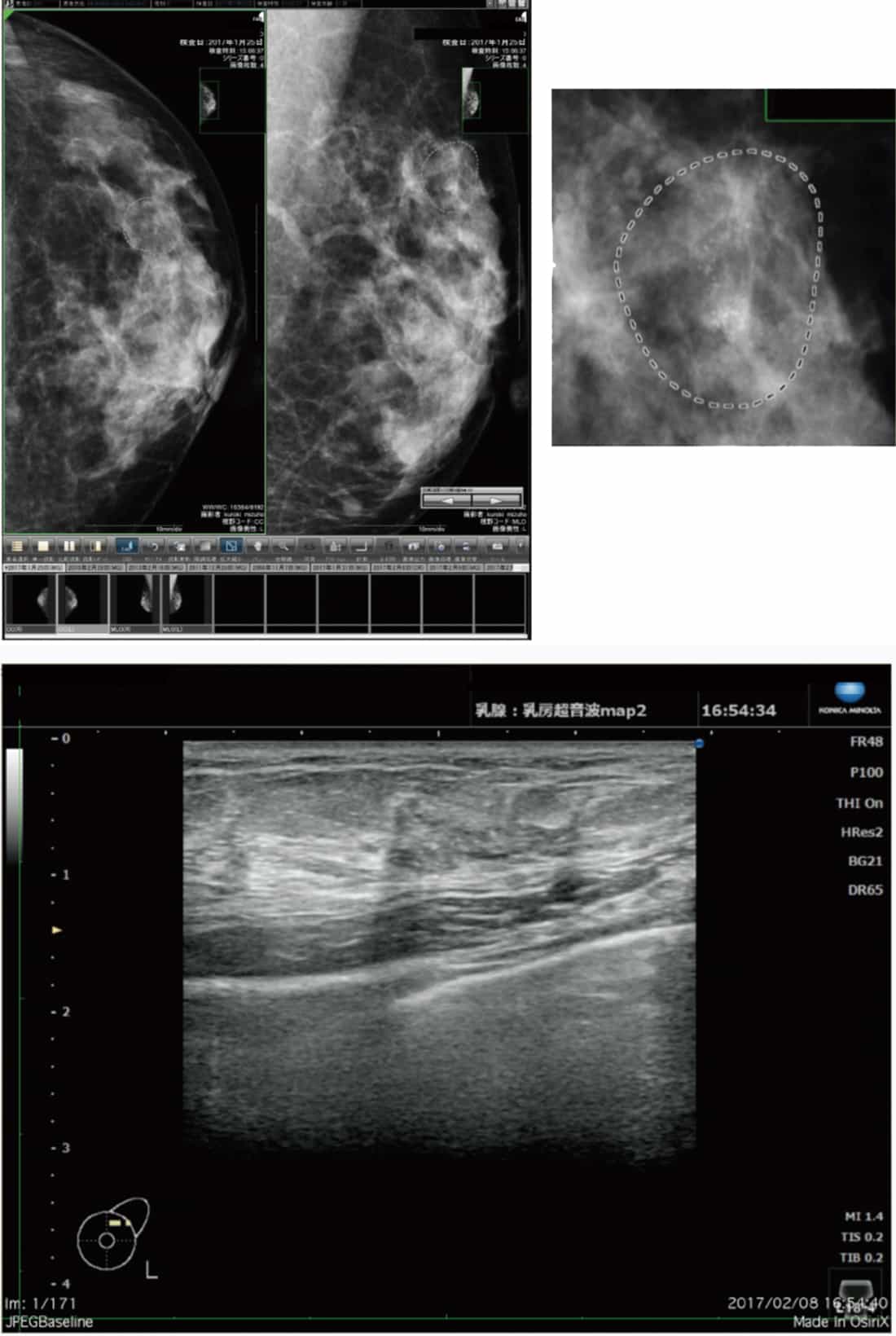 当院では、2011年から2016年までに、21,623名の検診を実施しました。 マンモグラフィは、40歳代は2方向、50歳代は1方向で撮影しています。 検診の流れは、マンモグラフィ撮影→超音波を実施する技師がモニタ画面でマンモグラフィを読影(第1読影)→CADを参考にしてマンモグラフィ所見を記入→CADと自身の読影を参考に超音波にてwhole breast scanning後、超音波所見を記入、というものです。 医師は、マンモグラフィ読影(第2読影)と技師の超音波所見から総合的に判断し、要精査かどうかを決定します。過去画像もモニタで確認しながら行います。 超音波画像はOsiriX(オザイリクス)というイメージ処理ソフトウェアで管理し、過去の動画も含めて参照できるようにしています(図2)。 技師にはマンモグラフィを読影する際、必ずCADが指摘した箇所をすべて所見用紙に記入し、そのすべての所見を超音波で見るよう指導しています。 所見用紙には、要FNAC(穿刺吸引細胞診)、要医師判定、不要FNACの項目があり、基本的に当院では細胞診を第一選択としています。 検診成績は、要精査率が4.2%、無自覚の癌発見率が0.54%で、陽性反応適中度は、無自覚の癌でも13.8%です。
