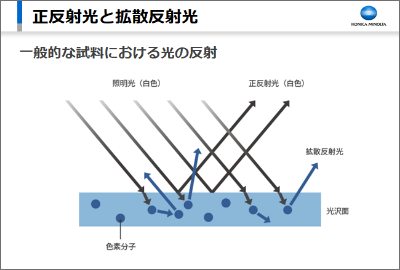 色素分子での反射光はランダムな方向に散乱するため拡散光となり、色素分子で光の選択吸収が行われるため、拡散光に色が付きます。