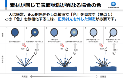 例えば同じ材料で、表面(光沢)状態が違うサンプルを評価する場合、正反射光と拡散反射光の比率により、見え方の差が発生します。