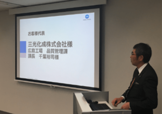 第2部では、三光化成株式会社 広島工場 品質保証部の千葉様より、分光測色計CM-26dGの導入事例紹介としてご講演頂きました。(大阪会場のみ講演、名古屋・東京会場はビデオ視聴)
