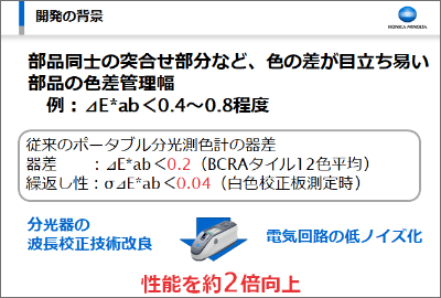従来のポータブル分光測色計の器差性能では、管理幅が厳しい部品をデジタルカラーデータを基準とした絶対値管理をすると、器差や繰返し性などの測定器起因の誤差により管理幅の半分程度を占めてしまうケースもあり、正確な品質管理ができませんでした。しかし「分光器の波長校正技術改良」や「電気回路の低ノイズ化」により大幅な性能向上したことで、デジタルカラーデータを基準とした絶対値管理が実現可能なレベルに引き上げることを実現しました。