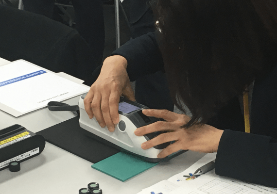 また、サンプル実測については、表面状態の異なる同じ素材の樹脂板、見た目で同じになるように違う素材(光沢の有り・無し)で作られた色チャートを用いて、SCEとSCIの使い分けについて実践で体験してもらいました。お客様からは「普段から測色計は使用しているが、ぼやっとしていたことが、講義とワークショップによって、よく理解できました。」という声を頂きました。