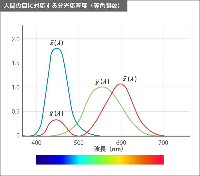 (λ)(ゼット・バー・ラムダ)は、青の波長域に大きな応答度を持っています。これが、物体からの光を受け