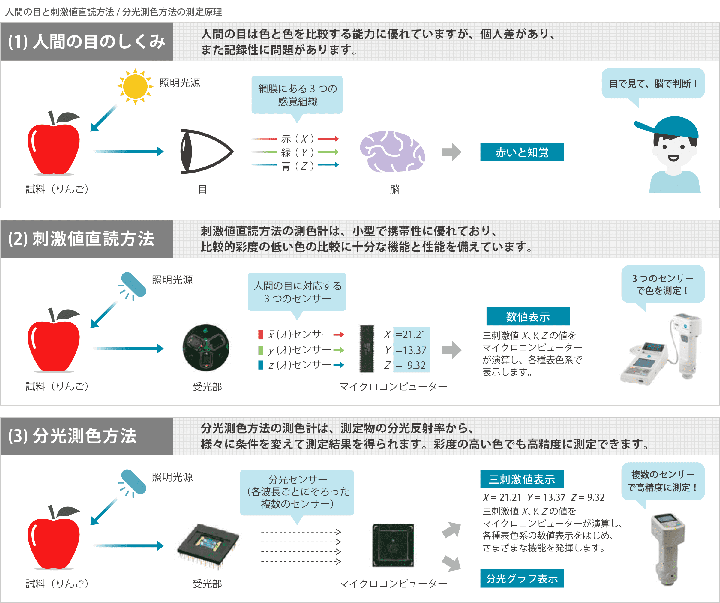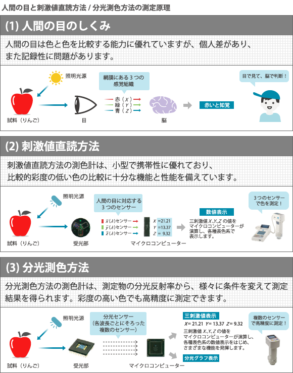 (λ)で試料を測定し、直接「三刺激値」と呼ばれるX、Y、Zの3つの値を測定する方法を言います。一方、分光測色方法は図24-(3)のように、試料から反射された光を回折格子等で分光し、これを複数※のセンサーで受光して、各波長の反射率を測定します。そして、そのデータをもとにマイコン部で積分計算を行い、三刺激値X、Y、Zの3つの値を算出します。ここでは、試料(りんご)の値がそれぞれX=21.21、Y=13.37、Z=9.32になっています。この3つの数値をもとにしてL*a*b*などの各種表色系による色の数値表示が行われるわけです。
