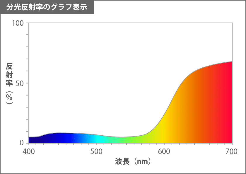 分光測色計は、色の数値化はもちろん、色の波長成分(反射率)をグラフ化して表示します。色はスペクトル(波長成分)がさまざまな割合で混ざり合ってできています。刺激値直読方法の測色計では、各表色系を使い、その色度図の中で、求める色がどの位置にあるかを知ることができます。分光測色計では更に、物体から反射された光を回折格子等で分光し、これを複数のセンサーで受光して各波長の反射率(光の量)を測定し、グラフ化することができます。