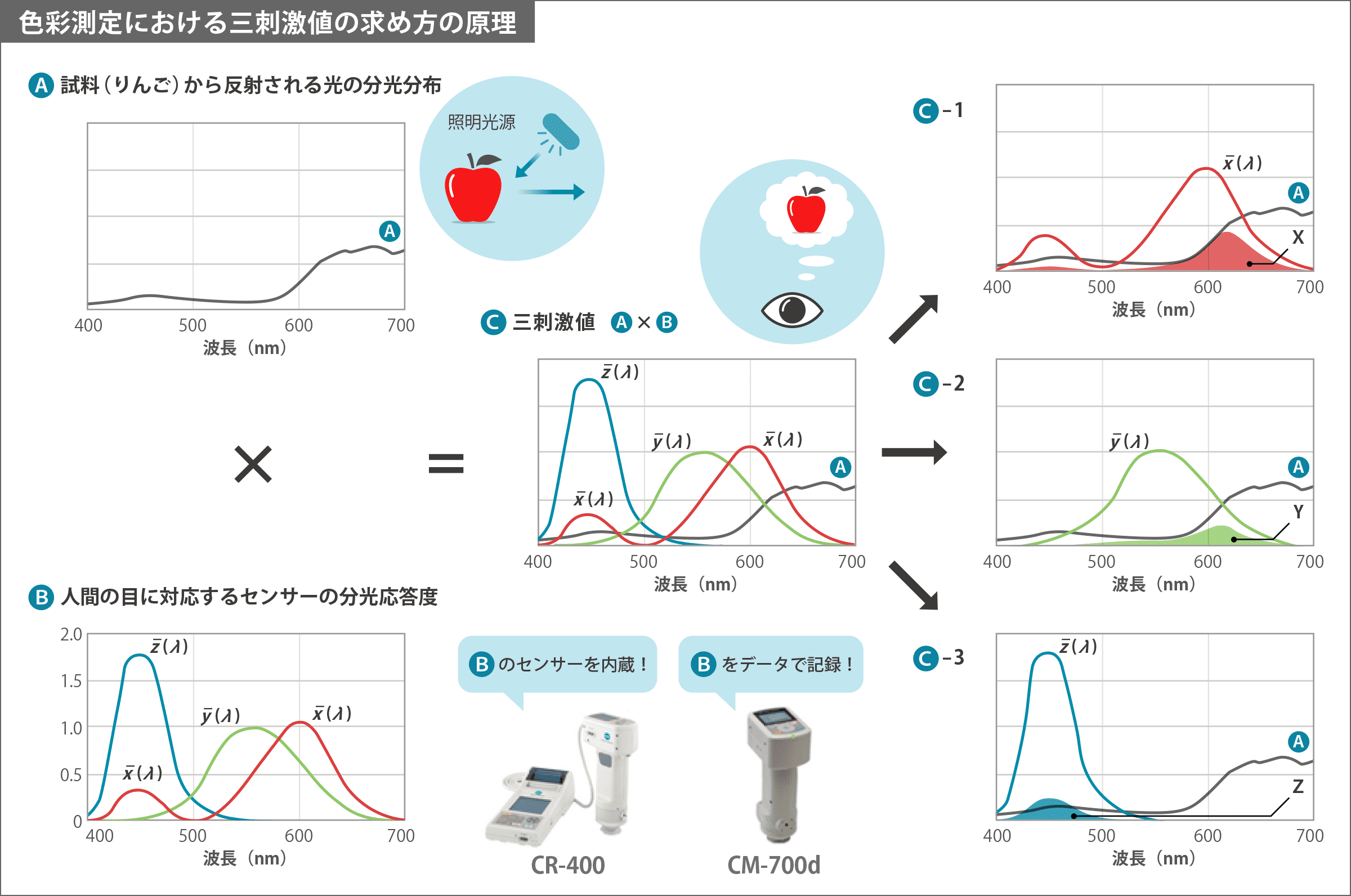 図25は、色彩測定における三刺激値(X、Y、Z)の求め方の原理を表したものです。図25で、 試料(りんご)からの反射光(分光分布)が