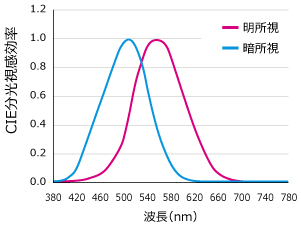 暗い環境下では、明るさに対する人間の目の感度は明るい環境下でのそれよりも、短波長(青色領域)側にシフトします。暗い環境下での、明るさに対する人間の目の感度を暗所視と呼びます。反対に、明るい環境下での、明るさに対する人間の目の感度を明所視と呼びます。