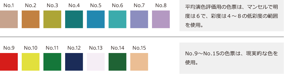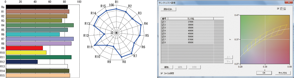 演色評価数には平均演色評価数(Ra)と特殊演色評価数(R1 ~ R15)がありますが、本測定器では、平均演色評価数Raだけでなく、R1からR15までの各特殊演色評価数も表示できますので、赤色のR9の測定値も簡単に測定が可能です。