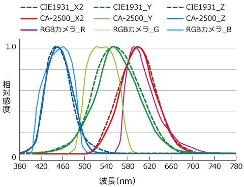 CIE 1931等色関数に近似した分光応答度を持つXYZフィルターを採用することで、デジタルビデオカメラなどで使用されているRGB 色分離フィルターなどに比べ、より人の目の感度と高い相関性のある輝度・色度の測定ができます。