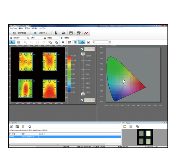 PCから測定器を制御し、測定からデータ分析、評価までを短時間で簡単に行えますので、スマートフォンやタブレットPC、各種ディスプレイなどの開発評価や検査が効率よくできる、2次元色彩輝度計 CA-2500に標準付属の専用ソフトウェアです。