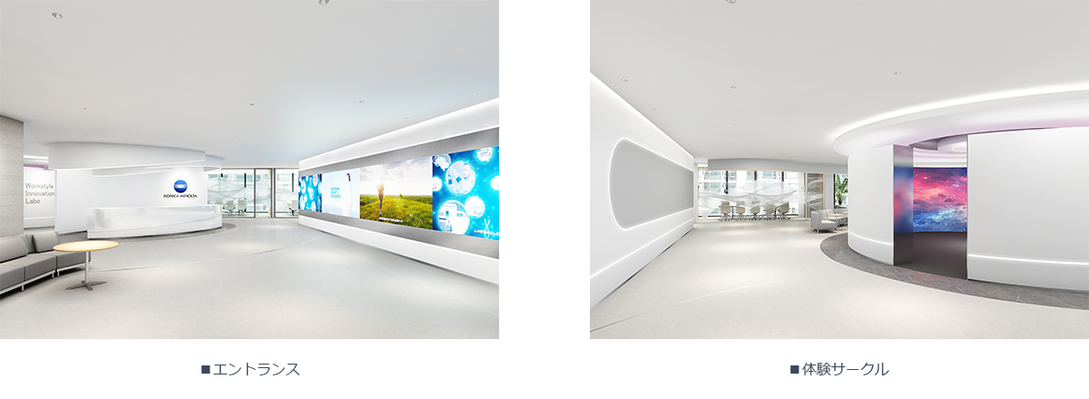 様々なコンテンツで最新の取り組みや事業内容、それらを培ってきた歴史と今後の目指すビジョンなどを紹介し、お客様とコニカミノルタの新たな出会いを創出します。エントランス中央に設置された体験サークルでは、320度に取り囲まれたコニカミノルタプラネタリウムが提供する「DYNAVISION-LED(ダイナビジョン エルイーディー)」※ディスプレイでコニカミノルタの過去・現在・未来について訴求する参加型の映像コンテンツを用意しており、共創や新規ビジネス創出に向けたイメージを膨らませることが可能です。