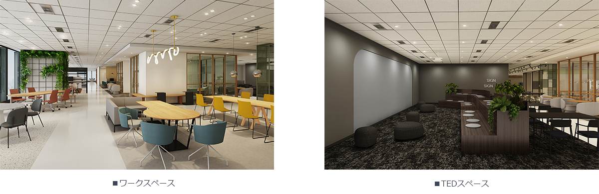 オフィスの中で事業や働く人がしっかり”みえる”ことを意識したデザインと、オフィス全体にちりばめられた会話や交流のきっかけを生み出す仕掛けによって、あらゆる垣根を越えた共創を促します。また各事業の最新の技術や商材・取り組みを働く人とともに紹介する区画の設置により、訪れたお客様へも新たなビジネスのアイデアの想起を促し、さらにその場で“つながる”ことができることによって、共創体験のきっかけを提供します。