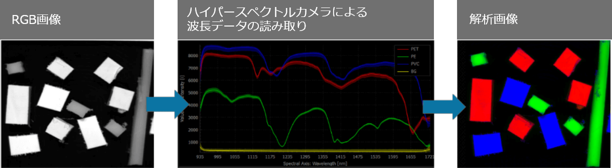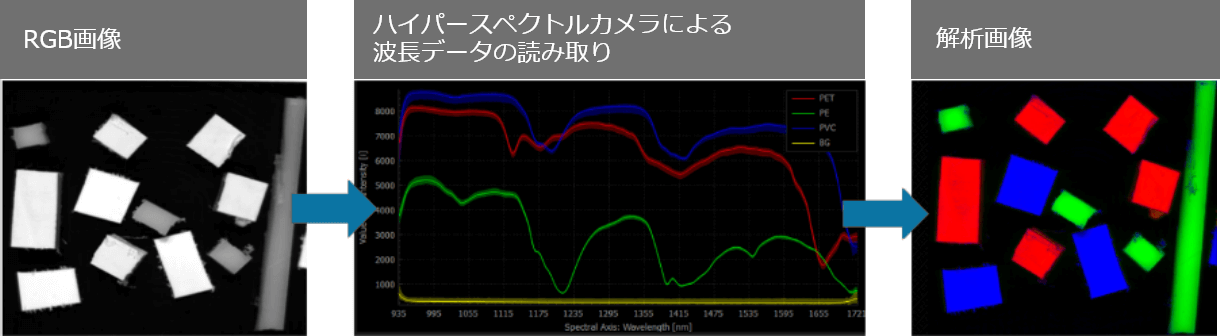 以下はプラスチックサンプルを例にした画です。左の画像は人の目やRGBカメラで見た原材料の情報です。可視光域を超える900nm-1700nm間に測定波長領域を持つハイパースペクトルカメラを利用すると中央の画像のように波長データを読み取り、右の画像にあるように原材料レベルでの分類が可能となります。
