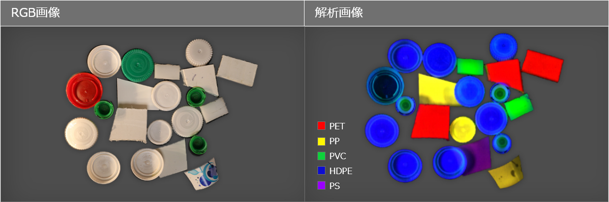 各プラスチック素材はそれぞれ特長的な反射特性をもっており、ハイパースペクトルカメラ「Specim FX-17」を使用するとPET、PP、PVC、HDPE、PS等の原材料レベルでの同定が可能となります。また、赤外域の長波長側に受光感度をもつ「Specim FX-50」を用いると今まで難しかった「黒色」のプラスチック素材であっても正確な分別も実現します。