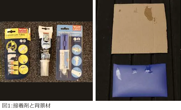 ・接着剤1、2、3(接着剤3はエポキシ)を、段ボールおよび合成ゴム上に塗布