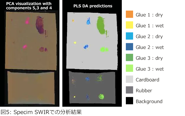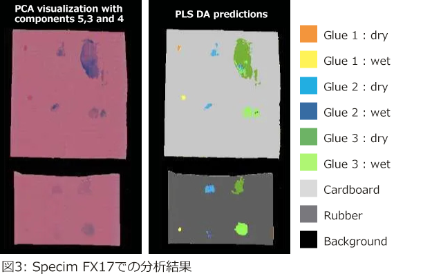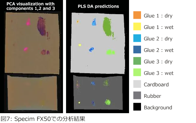 段ボールおよび合成ゴム上に3種類の接着剤(それぞれ湿潤状態・乾燥状態)を塗布し、Specim FX17カメラで測定を行いました。使用したハイパースペクトル画像のスペクトル分解能は8 nm、ピクセルサイズは約0.3 mmです。取得データに対し、主成分分析(PCA)および部分最小二乗判別分析(PLS-DA)を適用しました。