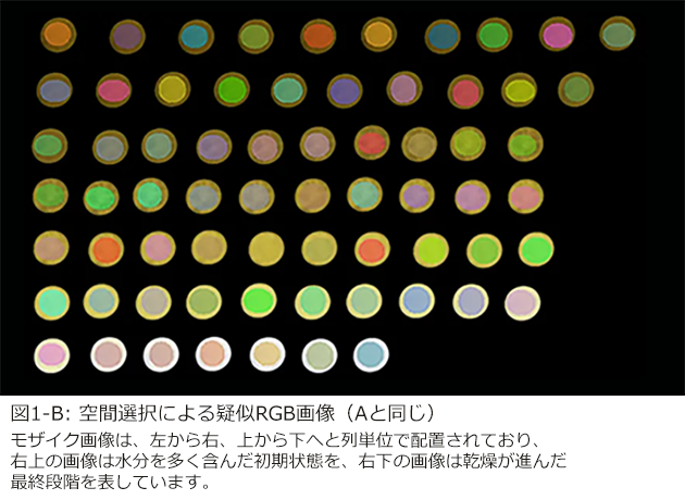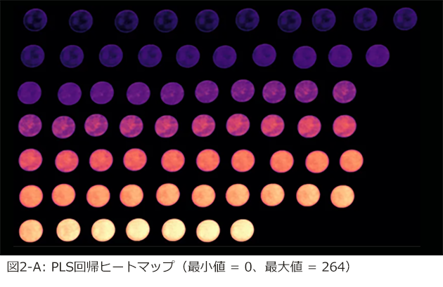 ・モデルに基づいて、各画像のスペクトル情報から乾燥度を予測し、ヒートマップとして可視化(図2A)