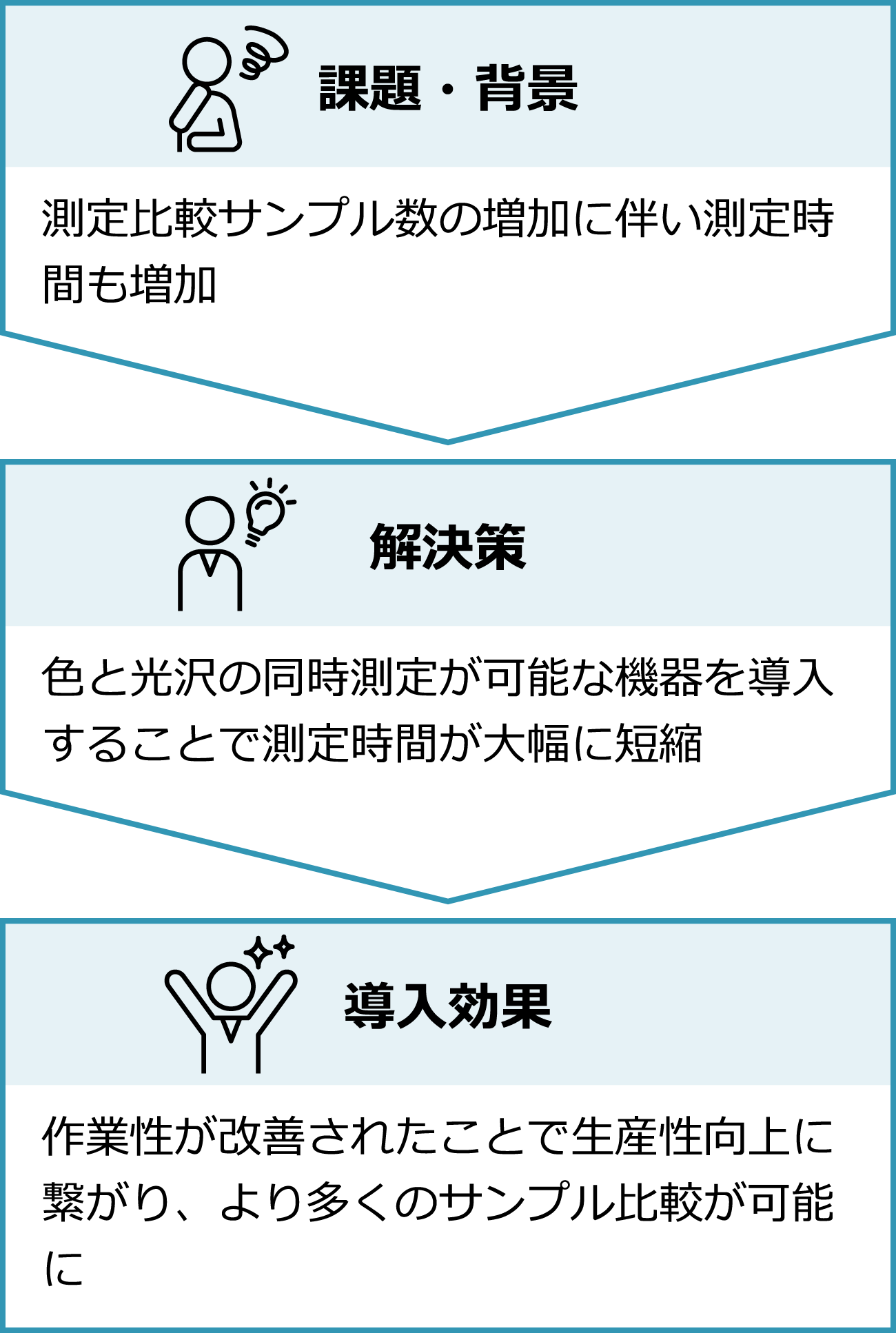 これまで『⾊』の測定は「分光測⾊計 CM-2600d」、『光沢度』の測定は「光沢計 GM-268Plus」を使用し、測定の再現性を上げるため、同⼀箇所を3回ずつ評価していました。工場が稼働して約7年経過し、測定比較サンプル数が増加。それに伴って作業時間と手間が増加しており、測定の精度を維持しながら効率化を進めることが課題となっていました。