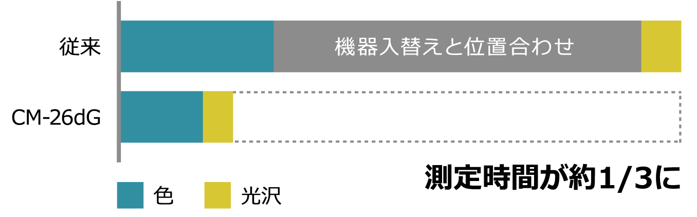 これまで約90秒要していた測定時間を約30秒に短縮。⼤幅な作業効率アップにつながり、⽣産性向上にも貢献しています。また、従来機では『⾊』と『光沢』の測定箇所の位置ずれも課題でしたが、⾊と光沢度を1台で同時に測定できるため、煩わしい位置合わせの作業が不要。同一ポイントの測定評価がスムーズになりました。