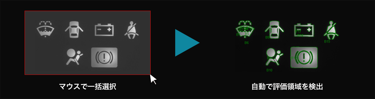 自動車のインストルメントパネル、スイッチ、ボタンなどの文字やアイコンの輝度・色度評価による解析において、文字やアイコンの評価を一つずつ設定する評価領域(測定したい場所)の設定作業は非常にわずらわしい作業です。 ProMetric では、ソフトウェア上で評価領域をコンピューターマウスを利用して一括選択することが可能なので閾値を設定すれば、自動的にそれぞれの文字、アイコンの評価領域を検出することができます。