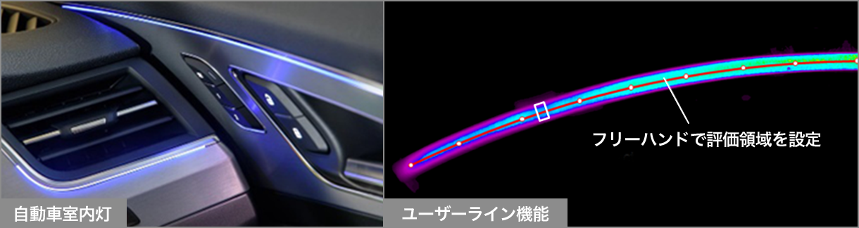 自動車の室内灯に利用されているライトガイド、導光棒、導光チューブなどの曲面や曲線デザインを持つ発光物の輝度・色度均一性の評価において、適切に評価領域(測定したい場所)を設定することは非常に手間がかかります。
