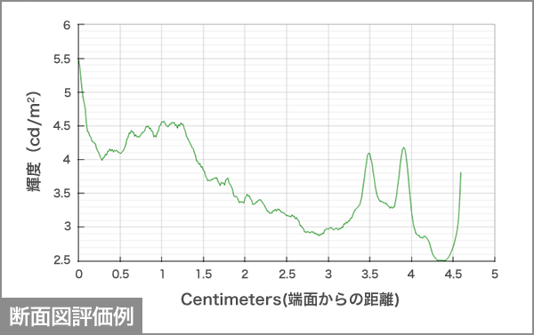 ProMetric では直性での評価領域の設定に加え、ユーザーライン機能を活用すれば、フリーハンドで自由自在に評価領域が設定できます。また、同機能を使って評価領域を設定して輝度・色度の断面図を解析することで、簡単に均一性・光モレの評価も実現。その他、曲線の太さも数値を入力することで容易に調整することができます。