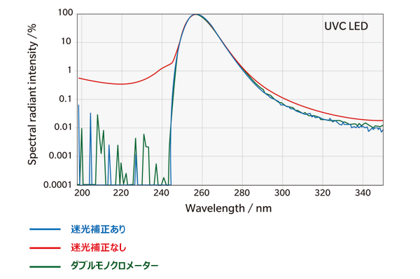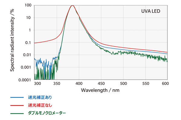 図1は、UVA LED のスペクトル測定における、迷光補正適用時(青線)とそうでない場合(赤線)、そして原理的に迷光が低いダブルモノクロメーター方式の分光器で測定した場合(緑線)の結果を示しています。350nm以下のUV域において迷光補正を適用した場合は、適用しない場合と比べて一桁以上迷光が抑えられていることがわかります。このケースでは迷光量としては10-5オーダーまで下げられ、放射強度の精度を3%以上改善することができました。