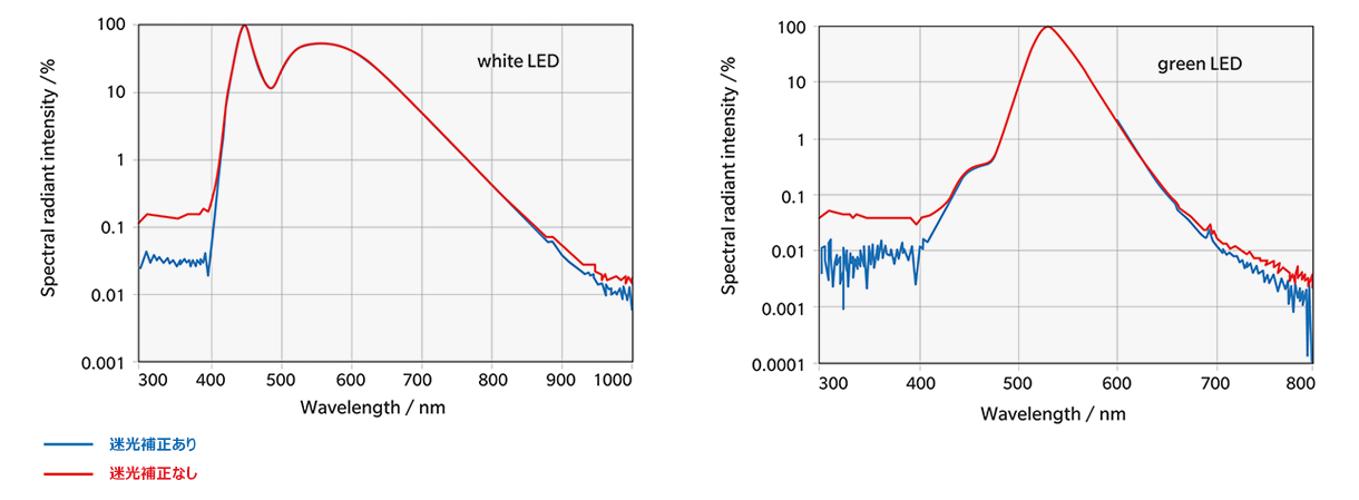 図3 は白色と緑色の標準LEDを測定した際の、迷光補正適用(青)と不適用(赤)のスペクトル結果を対数表示にて表しています。迷光補正の効果がはっきり出ていることがわかります。特に短波長側の青色域や紫外域において、迷光レベルは一桁近く下がり10-4から5・10-5 オーダーまで押さえることができています。
