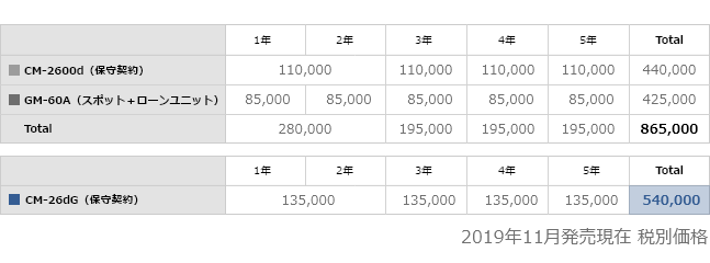 弊社ではご購入頂いたお客様に常に製品本体の高精度を維持してお使い頂きたいため、また、突発的な不具合を未然に防ぐためにも定期点検をおすすめしています。そのため、ここでは新規ご購入後のランニングコストとして保守契約※を含めた点検・校正サービスを軸に比較してみました。