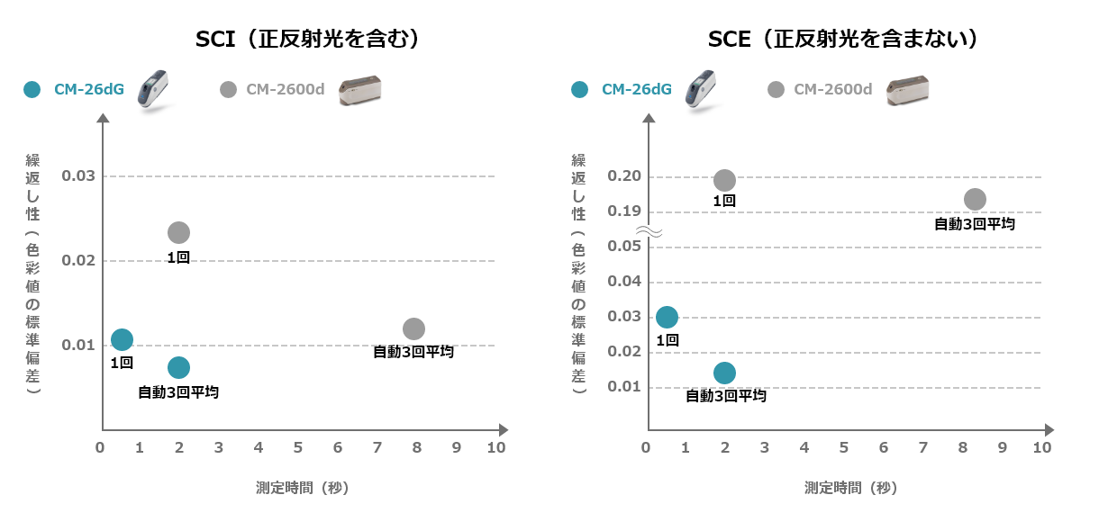 一方、CM-26dGでは1回の測定(約0.7秒)でも同等以上の繰返し性を実現することを読み取ることができます。