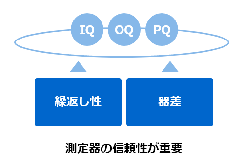 IQ/OQ/PQでは測定値のばらつきに影響をおよぼす「繰返し性」だけでなく、長期的なデータの信頼性に関わる「器差」の(機器間誤差)確認も必要です。