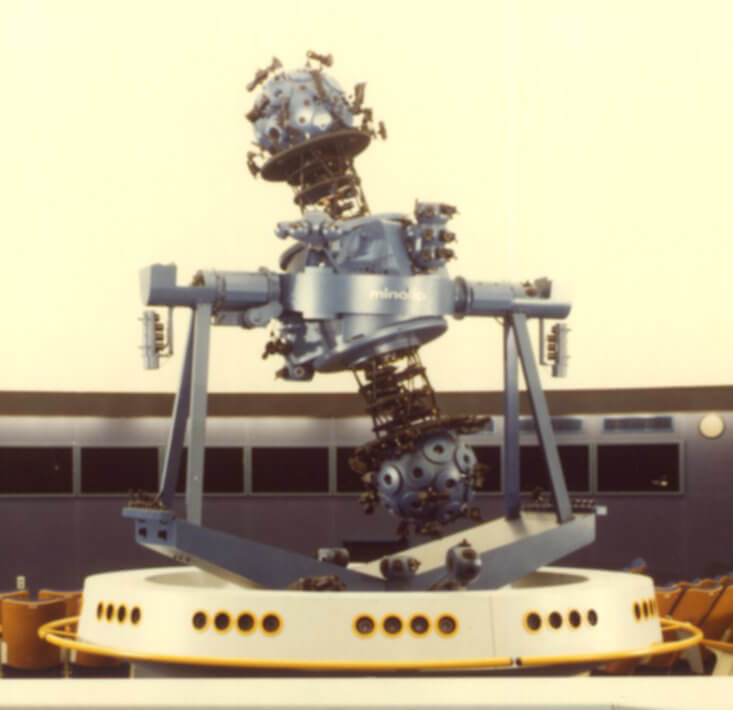 足もとにまで広がる星空の臨場感を演出する傾斜型ドームと、一球式プラネタリウム「インフィニウム」が登場。一球式の最大の特長は、太陽系の他の惑星から見た天体の動きを再現できることでした。1985年に開催された「つくば科学万博」では1号機が活躍しました。