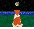 ナレーション:それは秋の日の出来事です。6才になったヒロシは、オシリとウシロアシを砂浜にペタンとつけて、海をながめていました。でも、夜なので、海は真っ暗。月明かりでかすかに遠い波が見えるだけです。