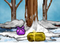 ある夜、うたた寝の男の耳にキツネの鳴き声が聞こえた。男が戸を開けると、篭に盛られた栗の実と、キツネ達の白い足跡が降り積もった雪の上に。『あの母子だ・・・』。男は見えぬ母子に頭を下げ続けた。