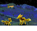 棲家の洞穴の中で身を寄せあって寝ていたキツネの母子。お腹を空かせた子ギツネが母ギツネを揺り起こし、村へ食べ物を捜しに行こうとせがむ。村へ行く恐さを説いていた母ギツネも遂には負け、母子は村へ。