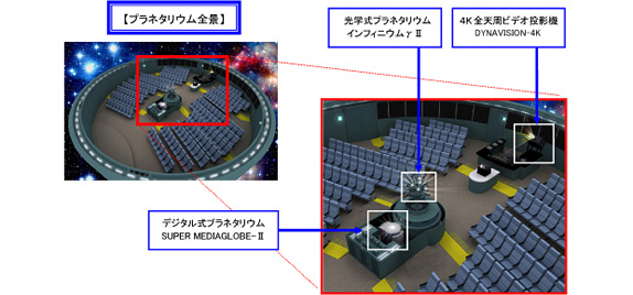- 光学式プラネタリウムとデジタル式プラネタリウムを完全統合でき、地上から肉眼で見る満天の星空と共に多彩なCGを組み合わせた、オリジナル演出番組の制作と上映が可能