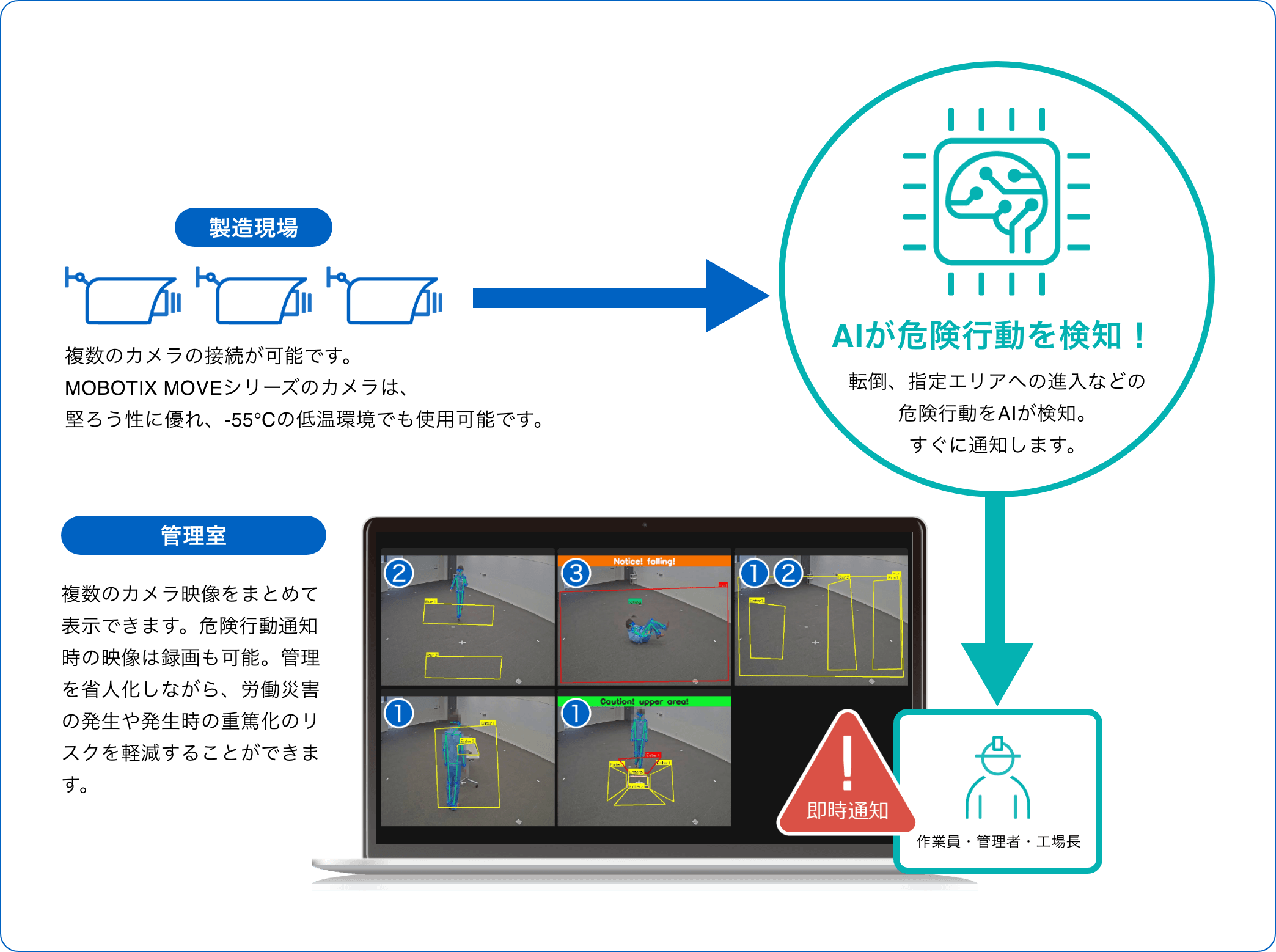 カメラ映像からAIが危険行動を検知し、